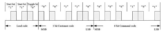 RC6 采用 36kHz 的红外载波调制,占空比在 25%~50% 之间。传输数据采用曼彻斯特编码,每一 bit 的长度为 888us(2T)。逻辑‘0’为 1T 的空间隔(无载波)在前,跟随 1Tm 的高电平(带载波)。逻辑‘1’为 1T 的高电平(带载波)在前,跟随 1T 的空间隔(无载波)。
