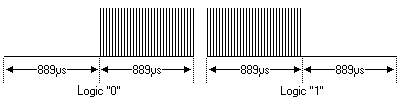 普通的数据都包括 1T 的调制信号和 1T 的空间隔。逻辑‘0’为 1T 的空间隔(无载波)在前,跟随 1Tm 的高电平(带载波)。逻辑‘1’为 1T 的高电平(带载波)在前,跟随 1T 的空间隔(无载波)。